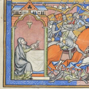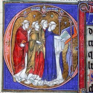 spätes 13. Jahrhundert, Hängelampen über einer Gruppe von vier Mönchen (fol. 100r)