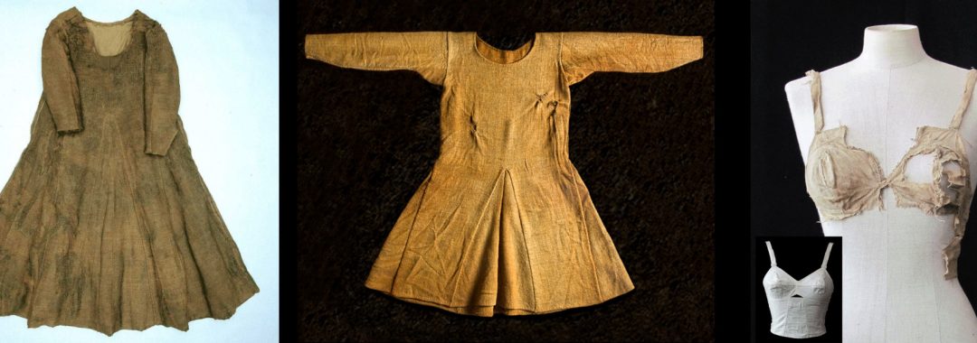 Schloss Lengberg, Osttirol – leinener „BH“ aus dem 15. Jahrhundert (großes Bild) im Vergleich mit einem Longline-BH aus den 1950er Jahren (kleines Bild unten links) (Foto: © Institut für Archäologien)