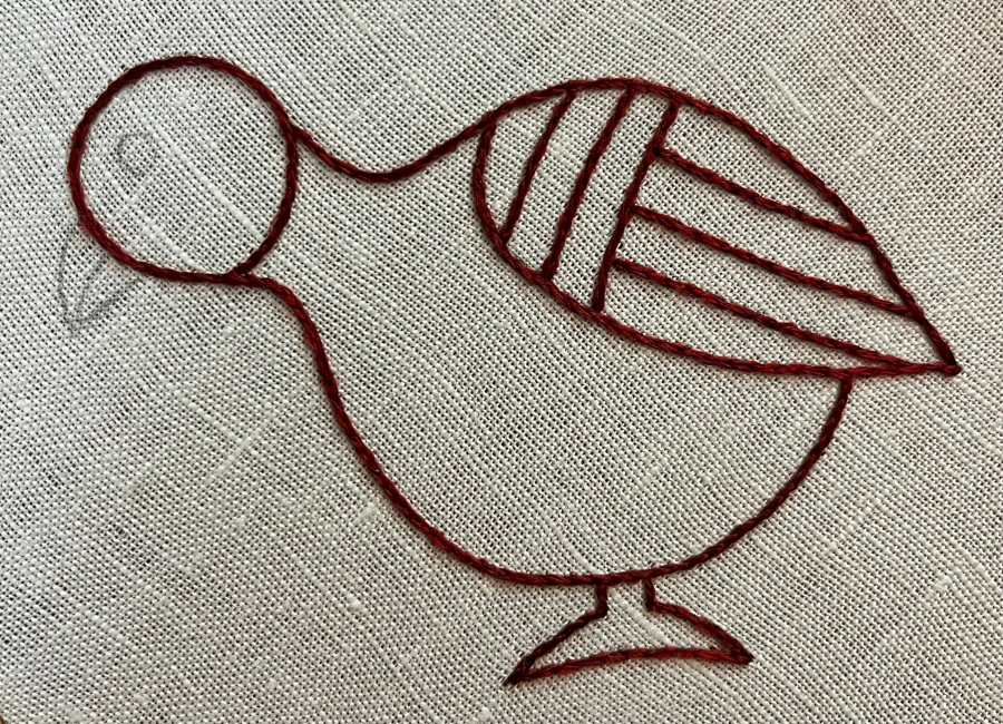 Ich habe dunkelroten Seidenfaden verwendet, um die Konturen des Vögelchen und ein paar Details, wie die Umrandung des Auges und die Abteilungen beim Flügel, zu "zeichnen".